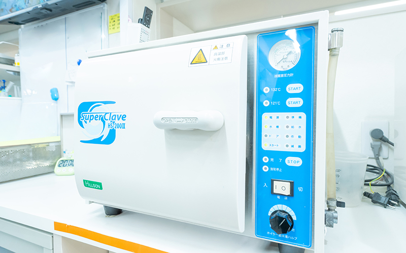 治療に使用した器具は、高温・高圧の蒸気で滅菌処理を行う専用機器「オートクレーブ」で徹底的に清潔にしています。感染予防のため、器具は患者さまごとに滅菌し、安心・安全な診療環境を整えています。